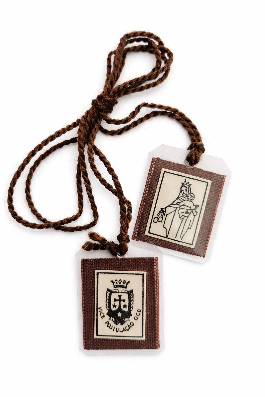 Escapulário de pano, simples e devocional, confeccionado artesanalmente pelas monjas do Carmelo de Santa Teresinha do Menino Jesus, em Campinas. Ideal para uso diário como sinal de fé e devoção.